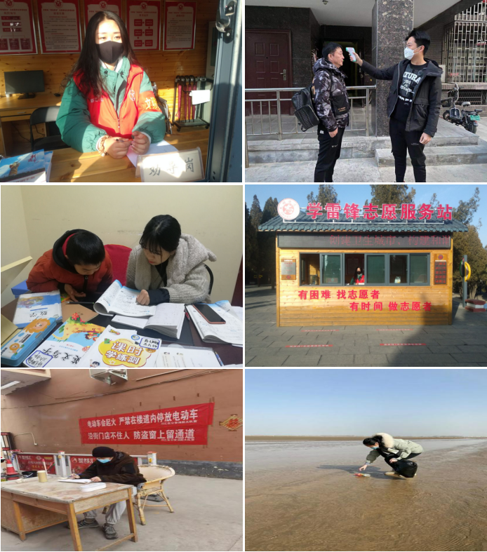 活动中,2020级园林专业1班谭璐自愿参加社会实践活动——改善黄河环境,尽己所能呼吁社会群众保护生态环境;2020级风景园林专业1班马鸣森志愿加入了周边小区的测温卫士和返乡记录人员,参与了小区返乡登记测温的志愿活动,为防控疫情奉献自己的青春力量;2020级城乡规划专业1班于佳珂在青屏山学雷锋志愿服务站服务游客,劝导大家保护环境、热爱大自然、不随处乱扔垃圾;2019级环境设计3班曾寒影在家乡车站志愿帮助检疫人员组织疏导群众配合检疫工作,为疫情防控工作贡献自己的一份力量;2020级产品设计3班蒋昊然在小区志愿量体温,在做好自身防护工作的同时,为国家以及社区的防疫工作尽出自己的一份力。