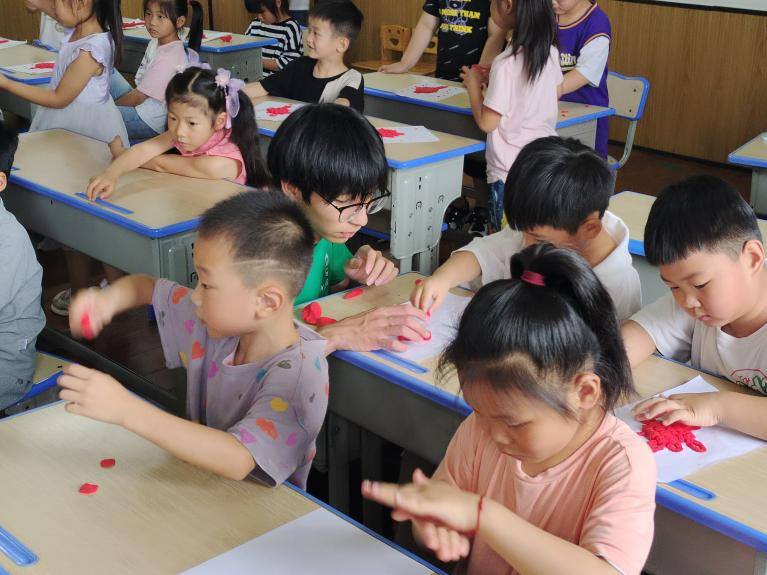 这次课堂的主题是用彩色黏土制作中国结装饰画,团队成员先向孩子们介绍中国结的来历和寓意,带领孩子们学习中国传统文化知识,并向他们示范制作过程。通过手工制作的方式,让孩子们体会到中国传统文化中具有独特美感和寓意的艺术形式。随后由孩子们自己动手实践,亲身体验,期间团队成员逐步引导孩子们完成中国结的制作。课堂上,欢声笑语不断,孩子们的脸上洋溢着快乐的笑容。