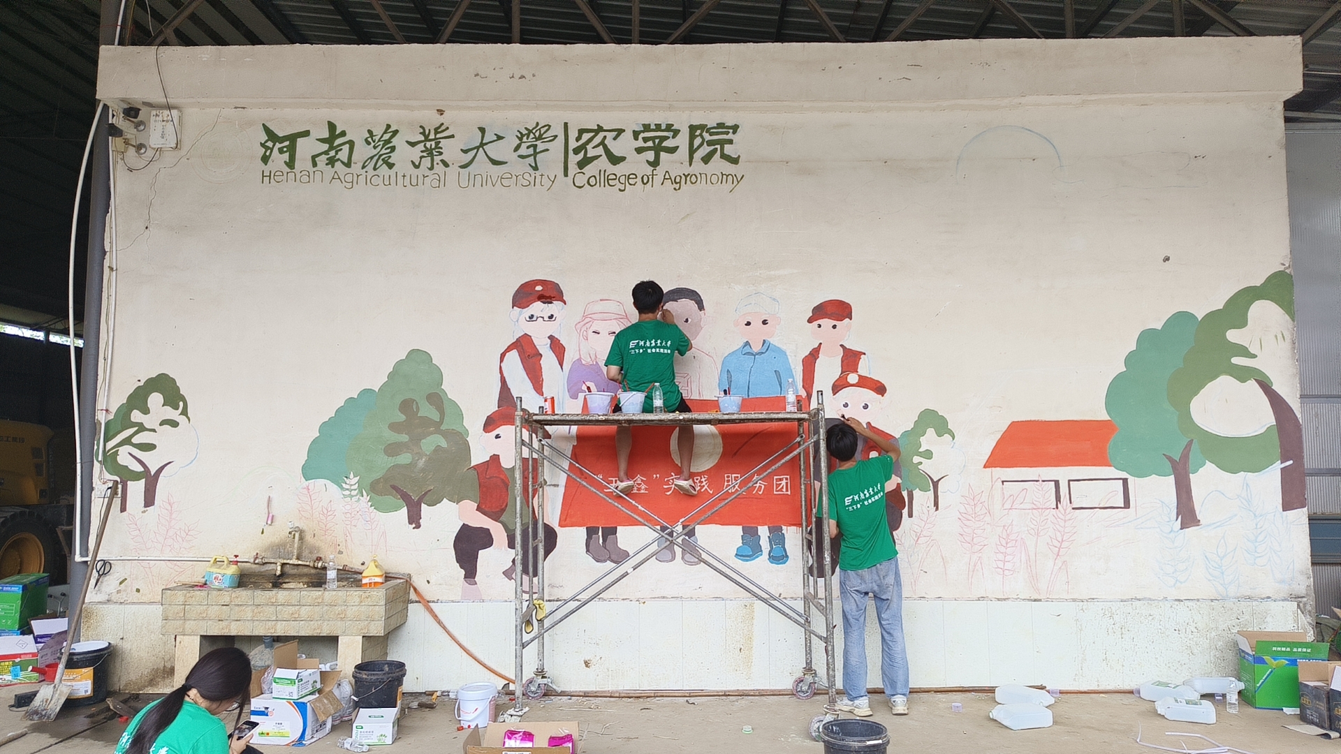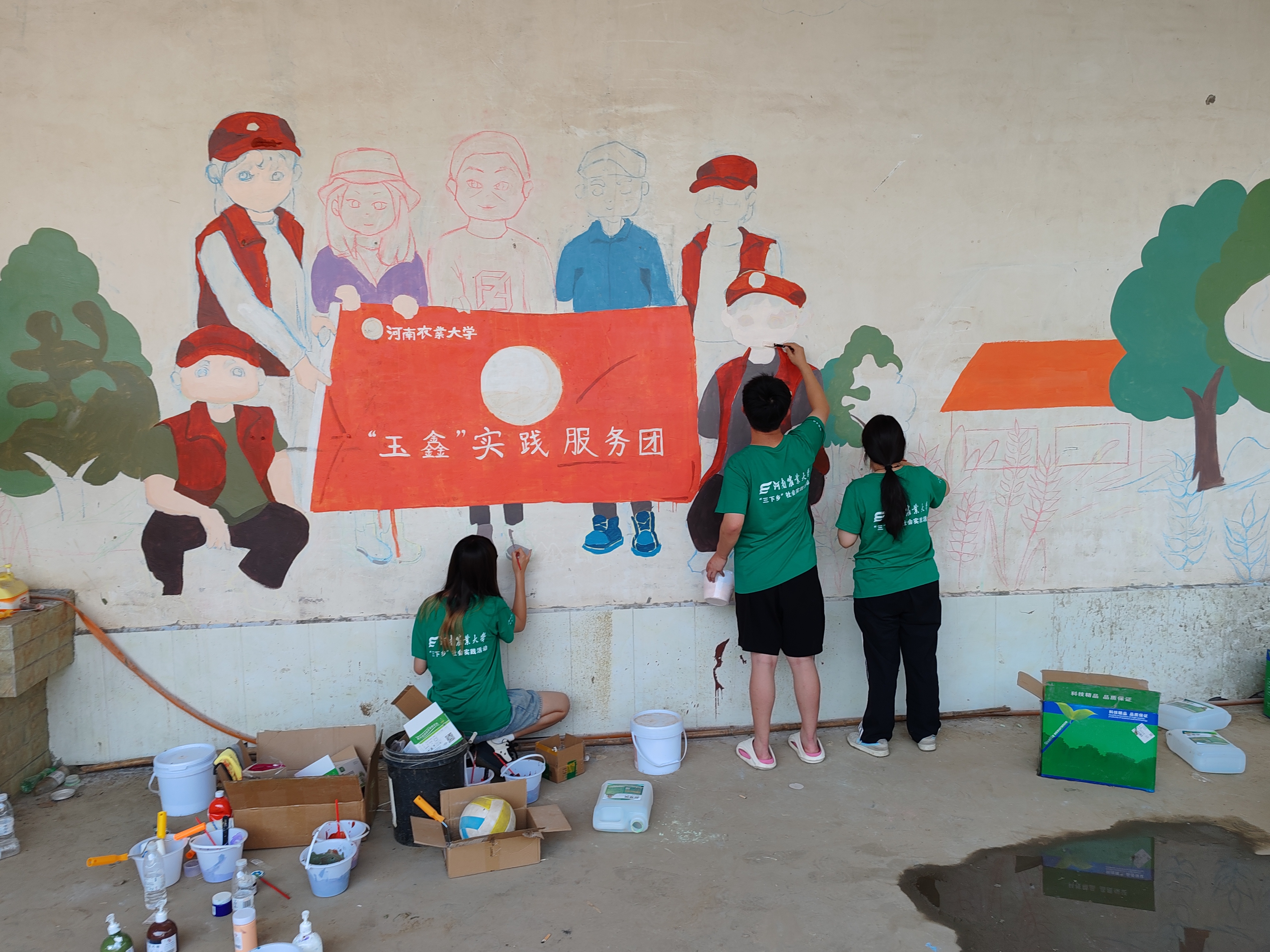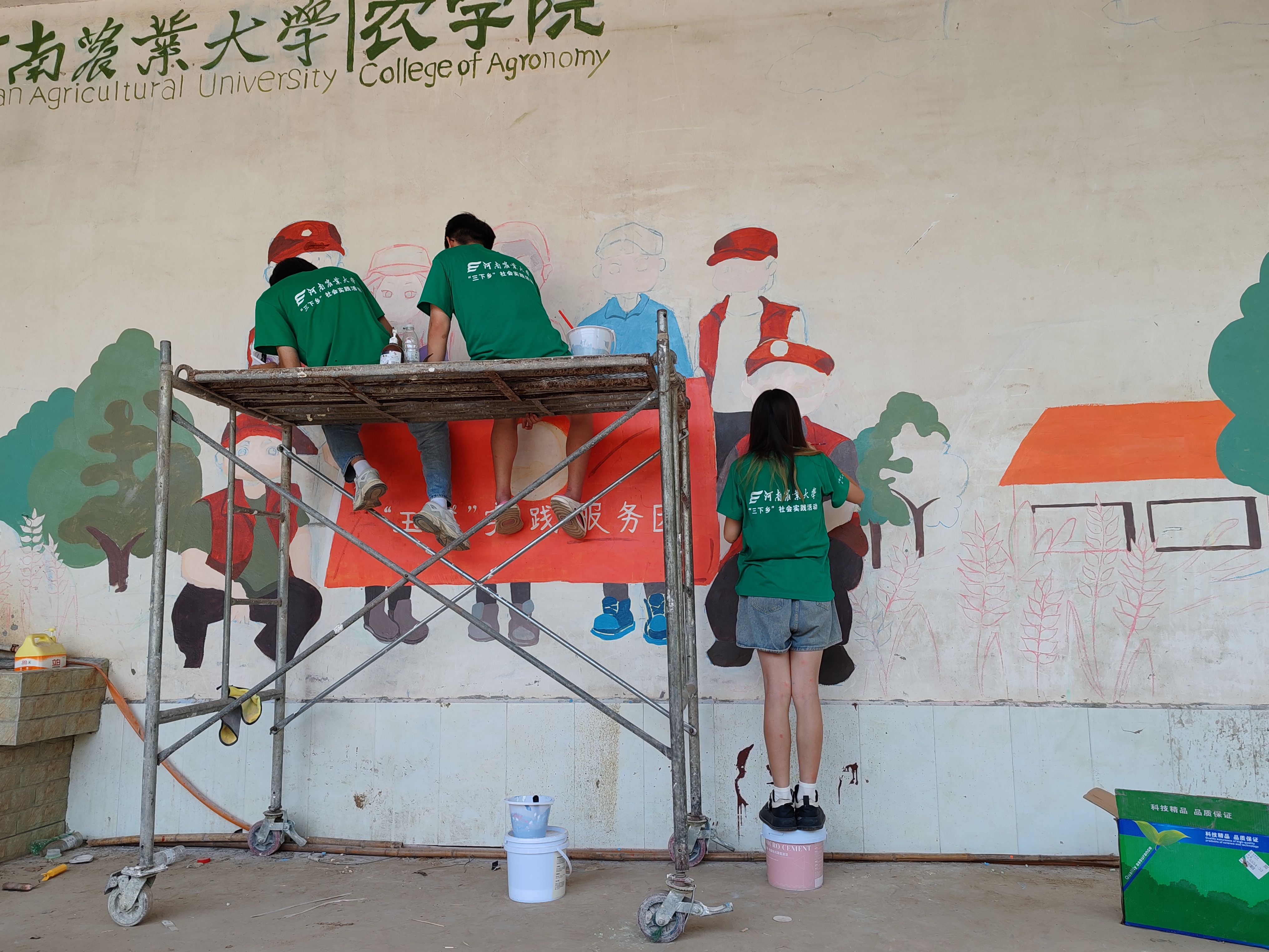 实践团成员经过前一天的努力,已经完成基本的绘图,刷漆,用画笔和创意为科技小院增添了一道靓丽的风景线。活动中,团队成员秉持用画笔描绘美丽乡村、为乡村注入文化血液的理念,积极与“科技小院”成员进行交流,真正深入了解乡村文化的发展现状和乡村振兴战略的实施情况,为科技赋农增添了新的艺术风韵。