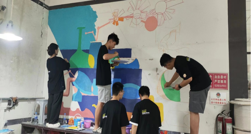 上午9时,绘画活动正式拉开帷幕。团队成员们充分发挥专业特长,紧锣密鼓、合理有序地进行调色,上色,勾线等工作,在绘画过程中,团队成员们不畏辛苦,认真细致地完成每一笔、每一划。他们不时与瓷器工作室内的工作人员交流互动,听取他们的意见和建议,确保绘画作品既能体现艺术美感,又能贴近绞胎瓷瓷器艺术。此外,部分村民也被学生们的热情和专注所感染,积极献言谏策,并主动向我们介绍瓷器的特点和纹路。与此同时,随着第一个墙面的进展加快,部分同学也参加到第二个墙面的绘制工作。