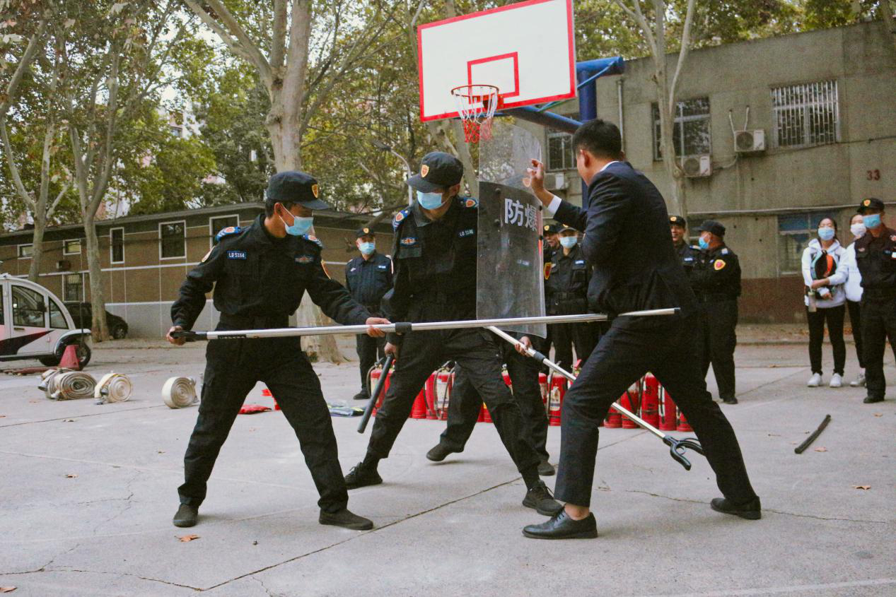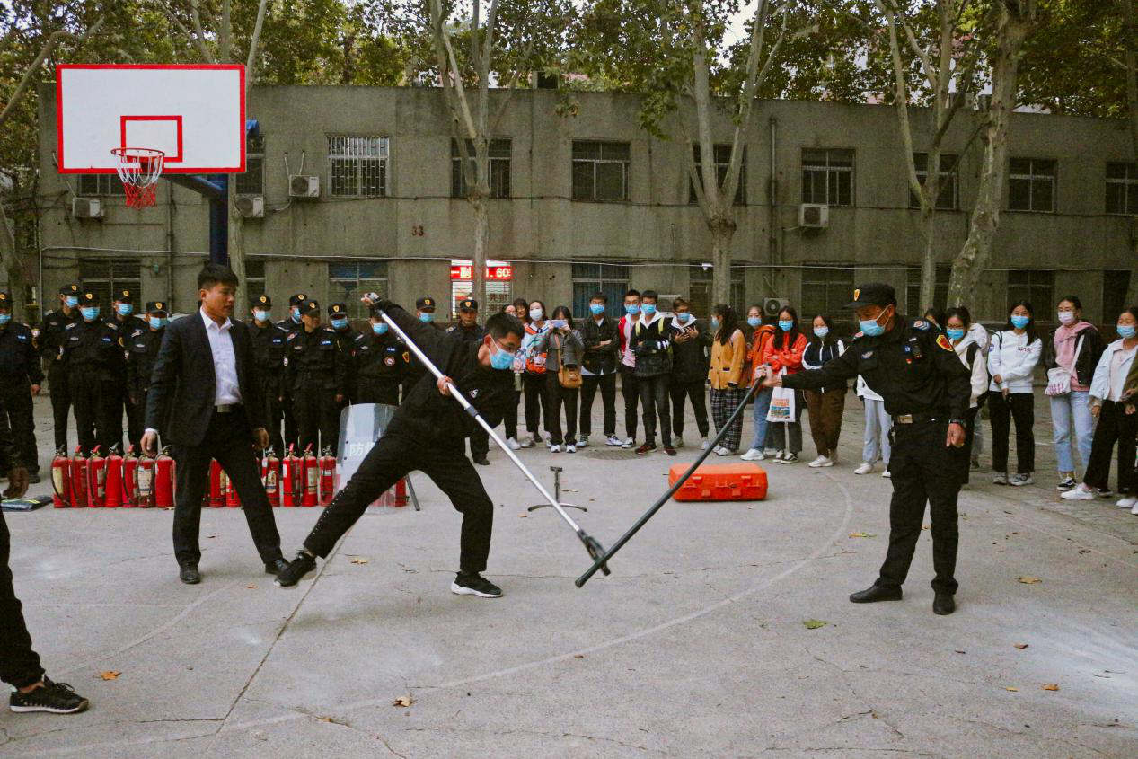 室外消防演练现场。曲志强教员给师生讲解和展示烟感报警器的工作原理,水基性灭火器、干粉灭火器、灭火毯、消防安全逃生锤等消防用品的使用方法,并组织师生进行模拟疏散演练和现场分批灭火操作演练。校保卫处老师向师生讲解和演练了喷雾剂、盾牌、警棍、防暴叉、防刺服等专用反恐防暴装备的使用方法、攻防技能和安全注意事项,并组织师生代表开展了盾牌警棍配合、防暴钢叉使用、单兵对抗、多人配合等校园反恐防暴突发性事件应急模拟训练和演练。演练现场组织有序、氛围热烈,师生参与热情高,纷纷评价现场学习效果好。