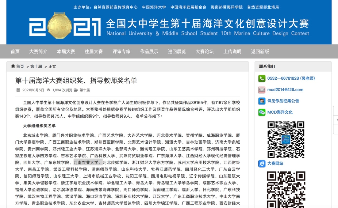 全国大中学生海洋文化创意设计大赛作为海洋文化传播和创意的新平台,开始于2012年。大赛由自然资源部宣传教育中心、自然资源部北海局、中国海洋发展基金会、中国海洋大学和海南热带海洋学院共同主办;大赛由中国海洋大学海洋文化创意设计发展中心承办,中国海油公益基金会协办。大赛系“世界海洋日暨海洋宣传日”活动之一,是全球唯一以海洋文化创意为主题的公益设计赛事,分别以“海洋·人类·和谐”“美丽海洋”“海洋强国梦”“丝路海洋”“创意海洋”“智慧海洋”“透明海洋”“生态海洋”“资源海洋”和“经略海洋”为主题成功举办了10届,共有1600余所高校、320余所中职(学)组织参赛,参赛学校覆盖全国。