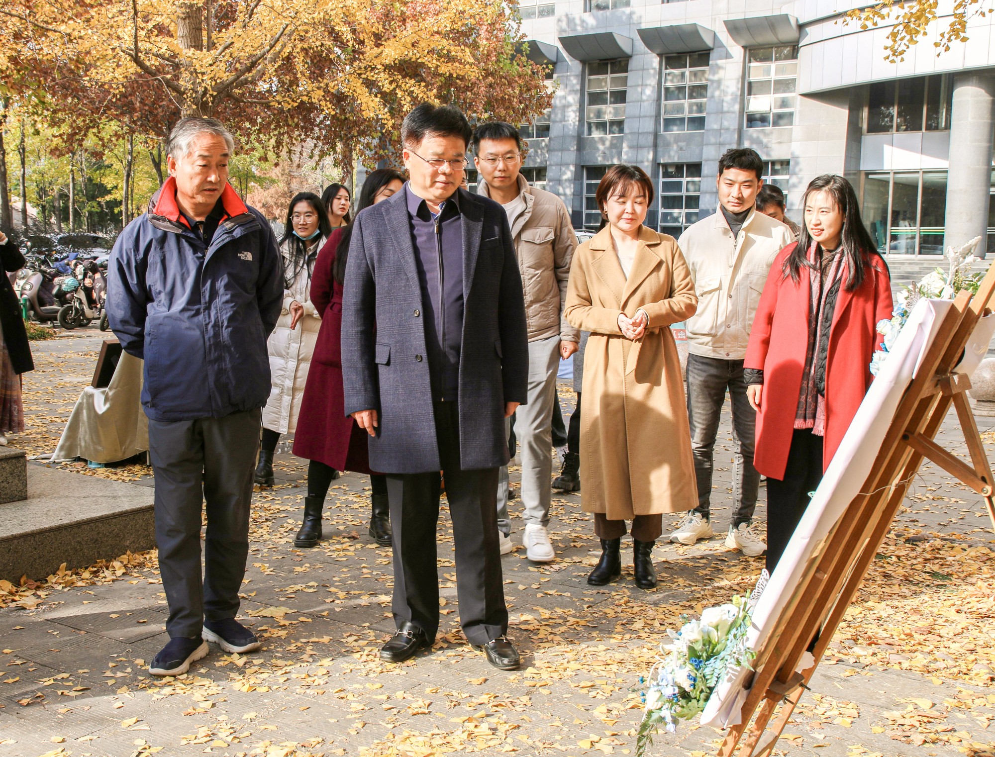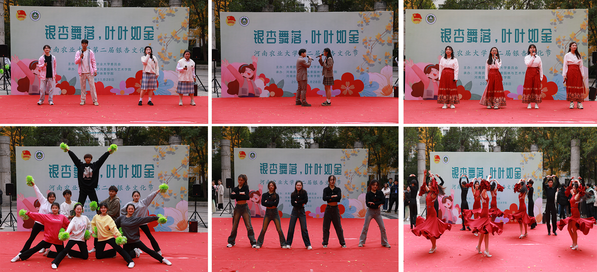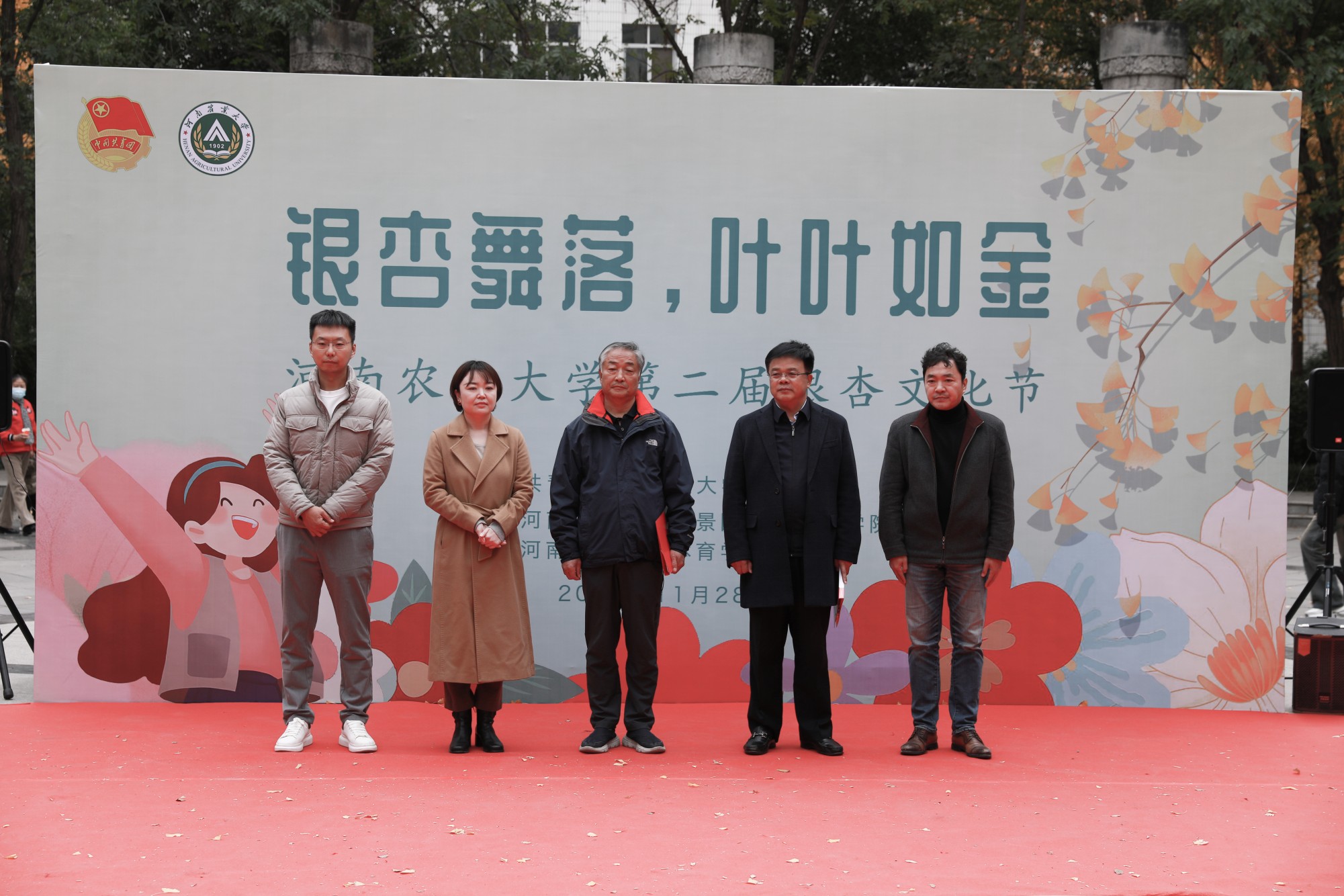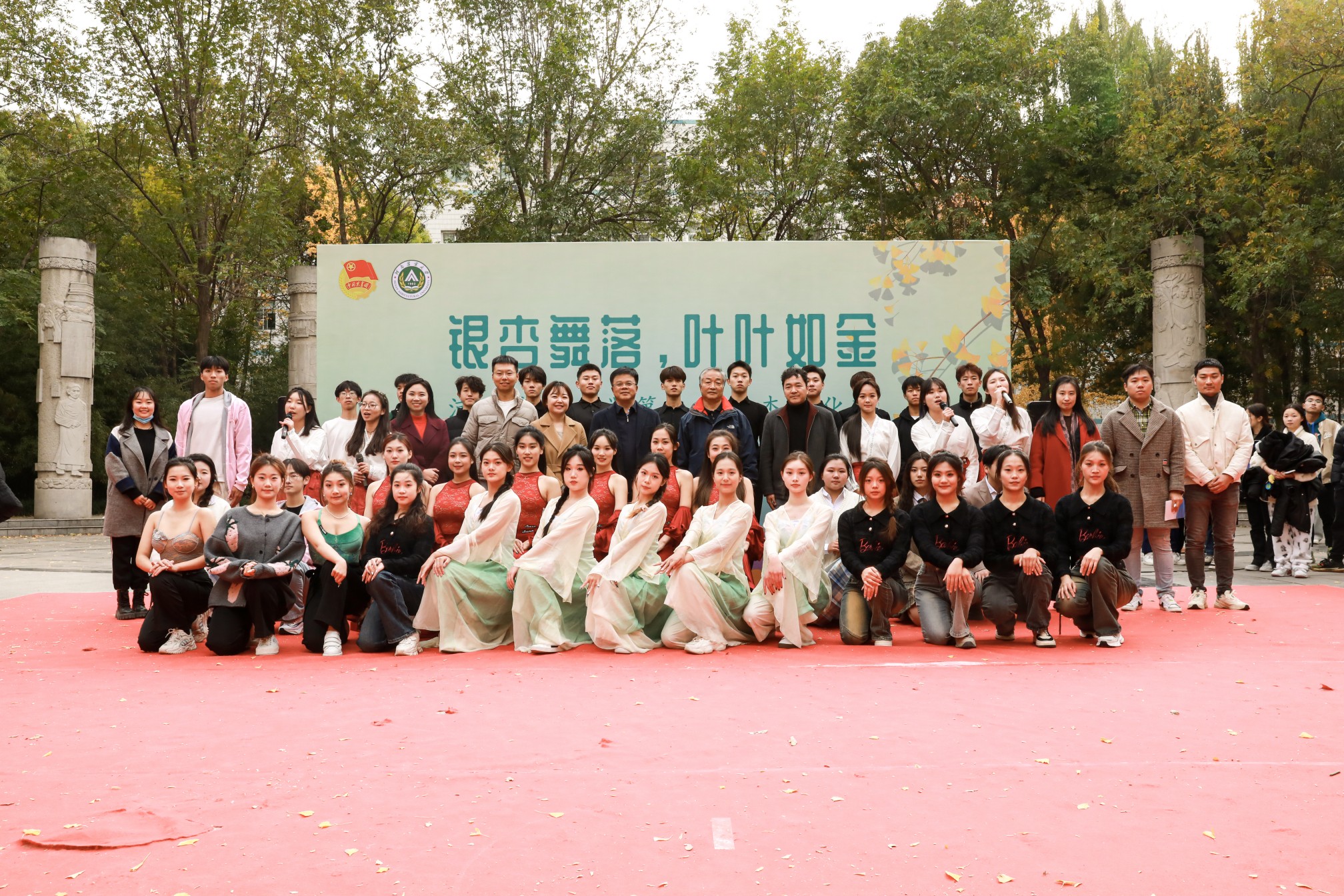和体育学院在文化路校区工程楼南举办“银杏舞落、叶叶如金”银杏文化节活动。校党委学生工作部部长徐峰、副部长张二龙、校团委副书记雷雯、风景园林与艺术学院院长田国行、党委副书记赵九阳及两院师生代表出席活动。