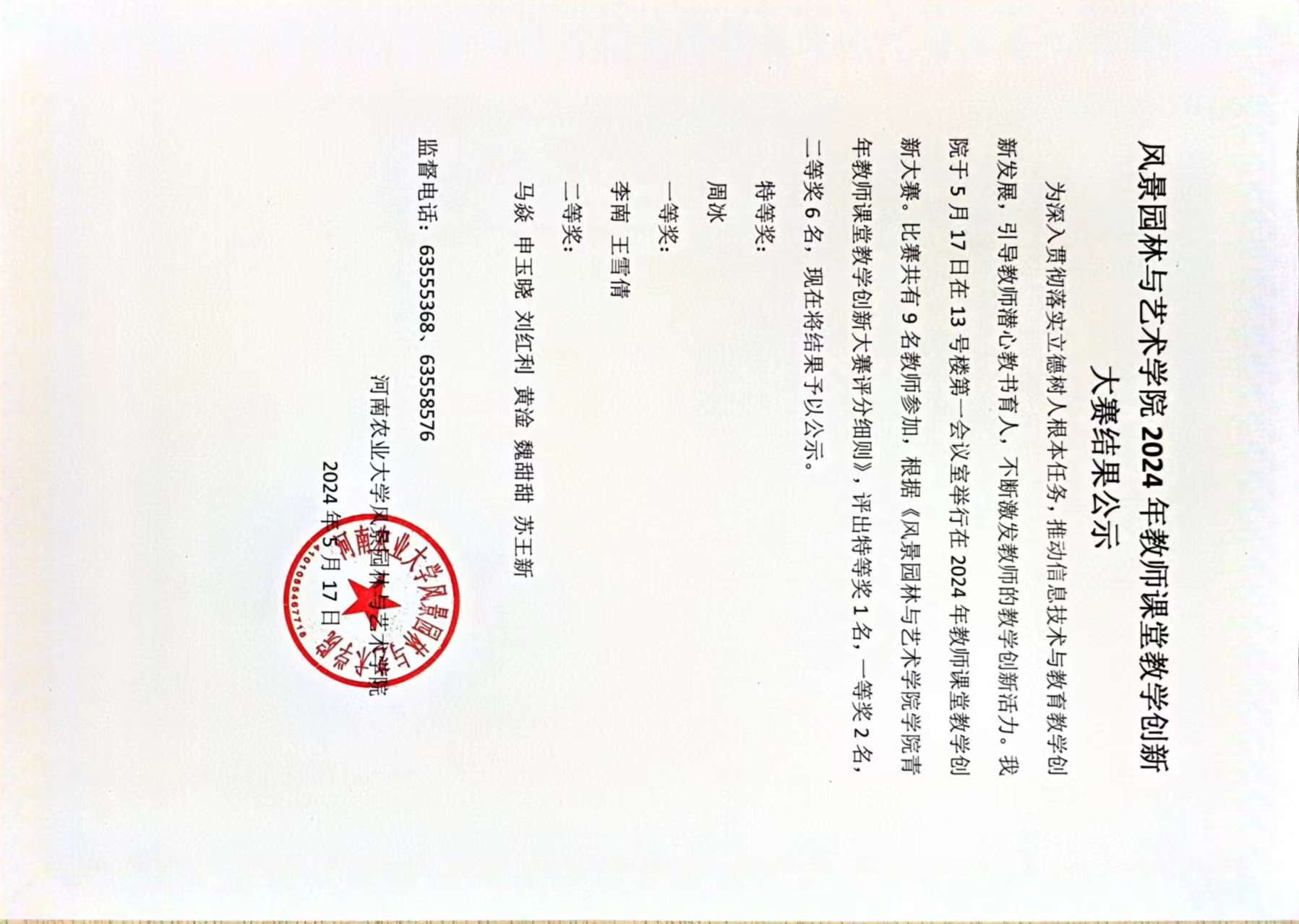 风景园林与艺术学院2024年教师课堂教学创新大赛结果公示