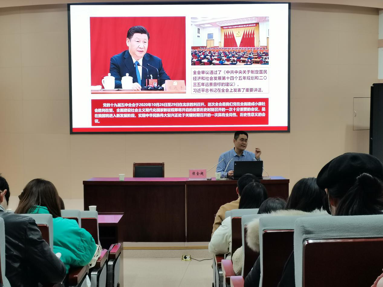 报告伊始,侯金超结合疫情期间国内外形势,着重分析了我国取得的重大战略成果,重申了中国特色社会主义的显著优势,进一步阐释了十九届五中全会对推动国家高质量发展、构建新发展格局所具有的重大而深远的意义。报告中,他以鲜活的事例,深入浅出地讲解十九届五中全会精神:一是要深刻认识我国进入新发展阶段的重大意义、有利条件和重要特征,要求新时代大学生要辩证地认识机遇和挑战的关系,学会化危为机;二是准确把握2035年远景目标和“十四五”时期我国发展的指导方针、主要目标、重点任务,要深刻认识实现“十四五”规划和2035年远景目标的任务艰巨,不断砥砺奋进;三是牢牢把握构建新发展格局的战略构想和重要着力点,他就大学生的责任与使命提出,青年学生应全面把握和正确理解加快构建新发展格局的重大意义;四是坚持党的全面领导,动员各方面力量为实现“十四五”规划和2035年远景目标而团结奋斗。