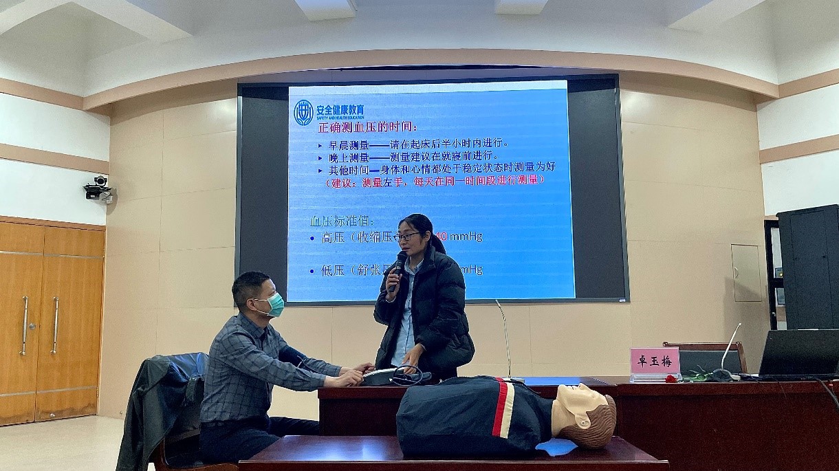 接着,卓玉梅结合生活实际案例和互动,展示了人工救助和人工呼吸、海姆立克急救法的正确手法、缺血预适应的操作方法;尤其就女性多发疾病的宫颈癌、乳腺癌以及高血压的预防和治疗进行了系统、全面的讲解。她建议老师们平时生活中应该养成定期体检的习惯,做到有病早发现、早治疗、早康复,有效避免疾病的发生。整个讲座内容丰富,通俗易懂,贴近女性,贴近实际,贴近生活。