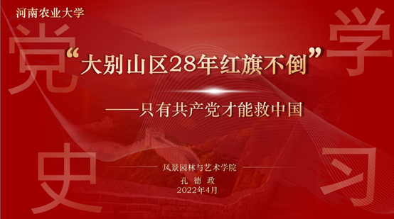 为弘扬革命精神,进一步激发党员学史明理、学史增信、学史崇德、学史力行的情怀,4月12日下午,风景园林与艺术学院风景园林系教工党支部和风景园林专业学生党支部在13号楼二楼会议室联合开展“师生联建学党史、汲取力量共奋进”主题党日活动。学院副院长孔德政教授做“大别山区28年红旗不倒”主题报告。