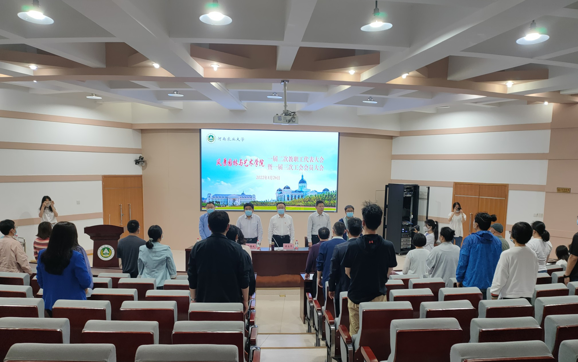 会议在慷慨激昂的国歌奏唱声中隆重开幕。副院长孔德政代表学院作《凝聚思想意识 激发奋进力量 奋力开创学院事业发展新局面》工作报告。