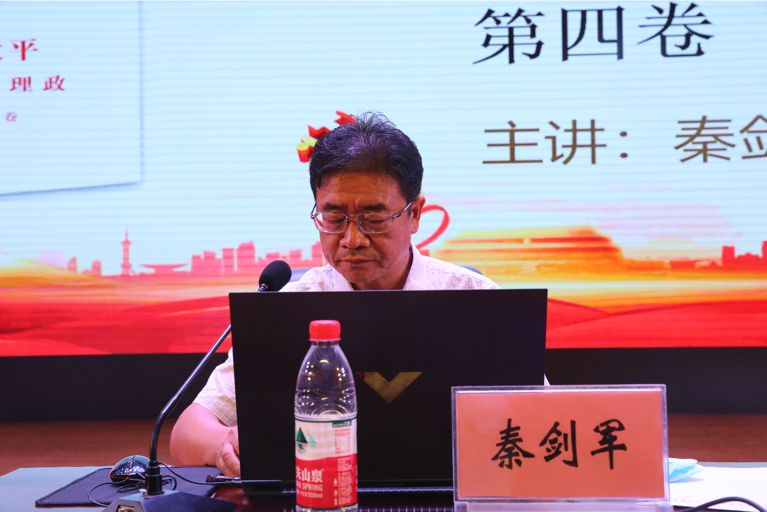 秦剑军从把握“两个确立”,做到绝对忠诚;把握“两个结合”,坚定理想信念;把握“两个大局”,坚持敢于斗争;把握“两件大事”,强化责任担当;把握“两个答案”,永葆先进本色等5个方面,科学解读了《习近平谈治国理念》第四卷主要内容和核心要义。他表示,站在世界百年未有之大变局的重要节点,广大青年学生要勇担时代责任。他勉励学生们要珍惜时光,坚定理想信念,时刻以知识武装自己的头脑,涵养家国情怀,以行动锤炼自己的体魄,用自身所学回报国家和社会,用青春的活力书写人生的新篇章。
