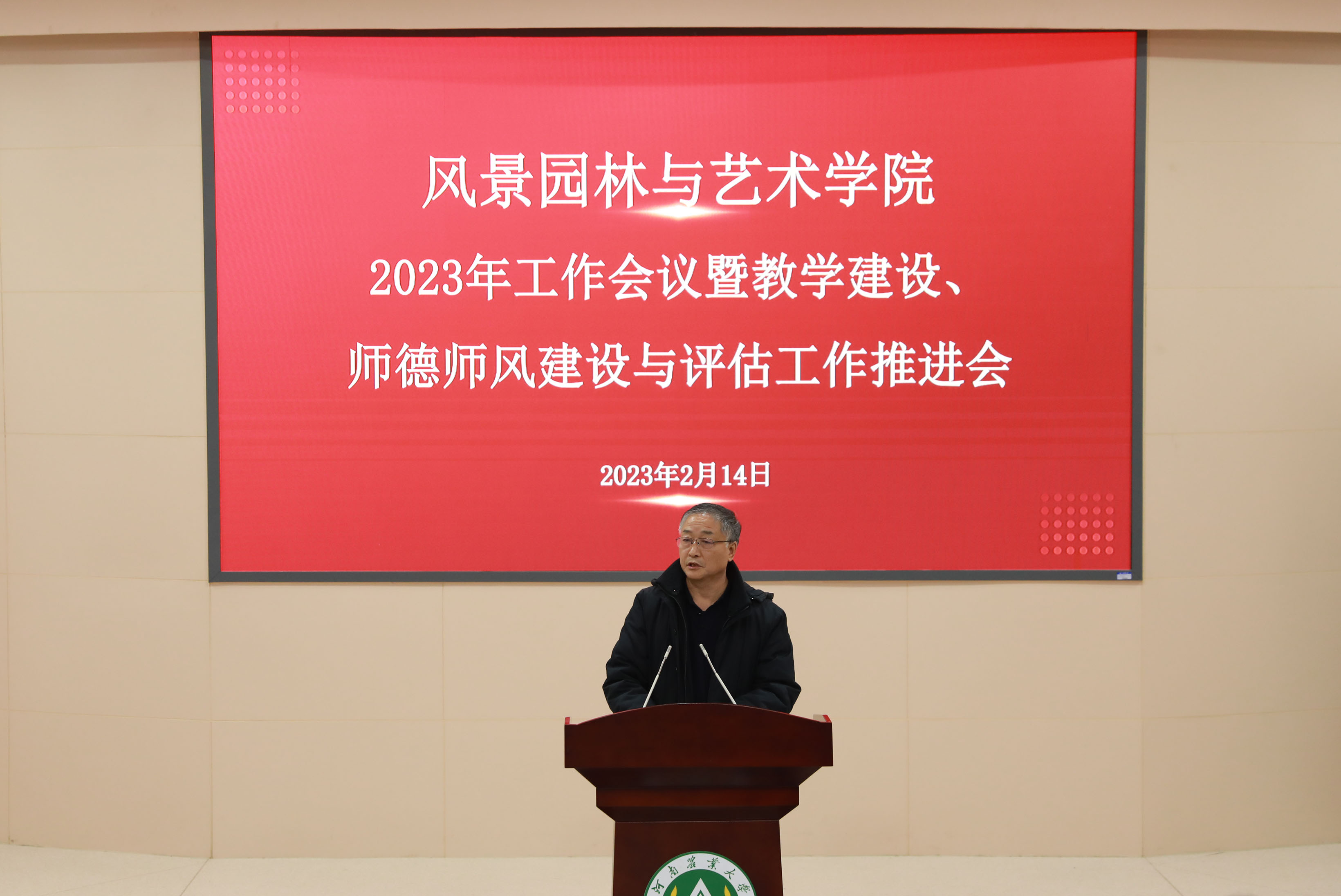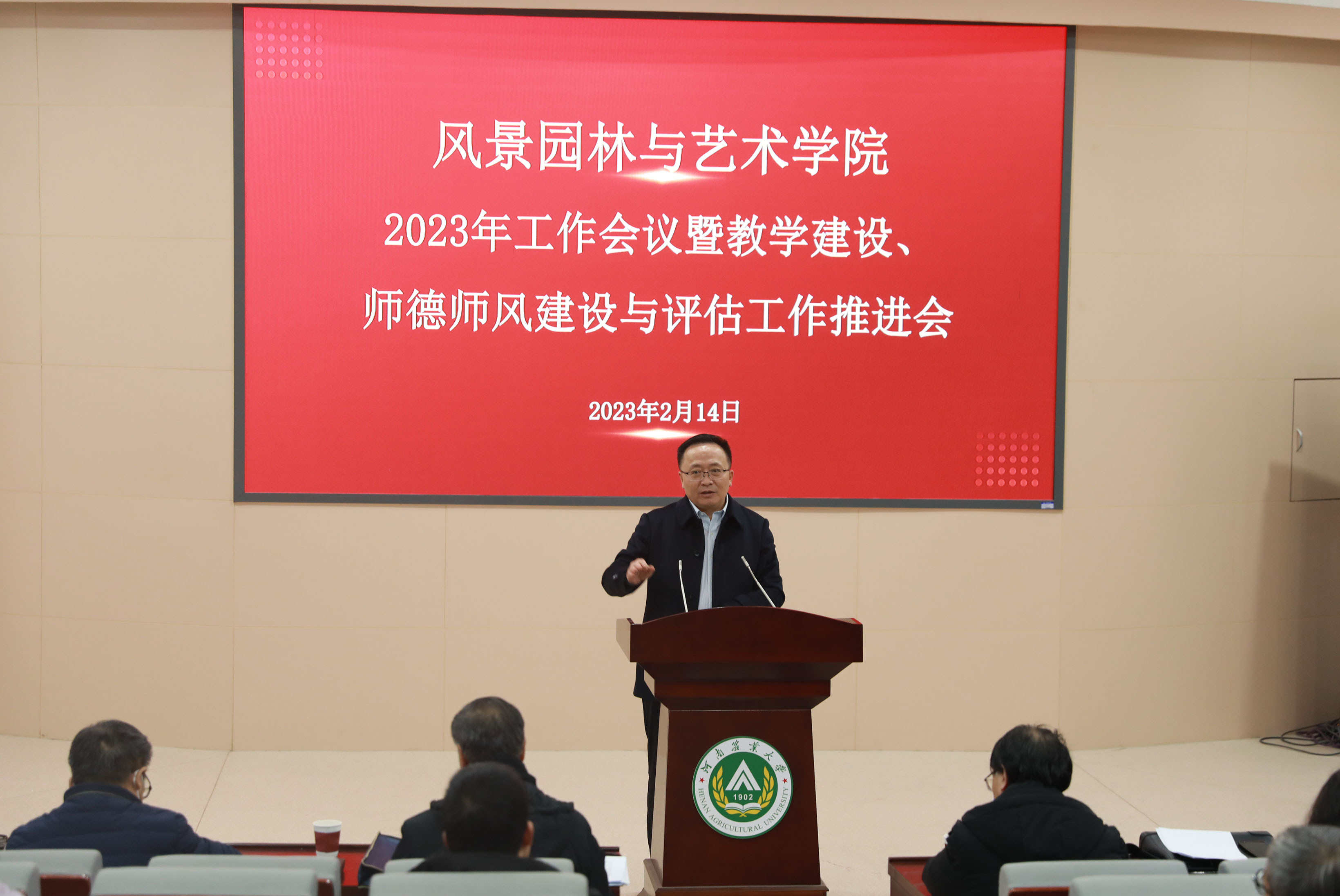院长田国行传达了学校 “学习党的二十大精神 深化教育教学改革”培训班暨教学建设与评估工作推进会会议精神,重点回顾总结了过去一年学院教育教学工作,肯定了成绩,分析了学院在教学建设、师德师风以及教学评估方面存在的不足,并提出了工作要求。他从持续加强学科内涵建设、加快提升科技创新能力、加速拓展科技创新平台、不断提升国际合作交流水平、进一步强化社会服务等方面对学院2023年重点工作进行了部署。他再次分享了在学院中层干部会议中讲述的9个方面的要求:讲底线、讲规矩、讲初心、讲实效、讲贡献、讲格局、讲团结、讲自省、讲定力,进一步加强和改进师德师风建设,进一步提升学院师德师风建设整体水平,引导教师把个人发展融入到学院发展,提升教师参与感、获得感和荣誉感,以昂扬向上的精神面貌和立德树人的扎实行动,扎实做好迎评工作,推动学院事业再上新台阶、再创新业绩。