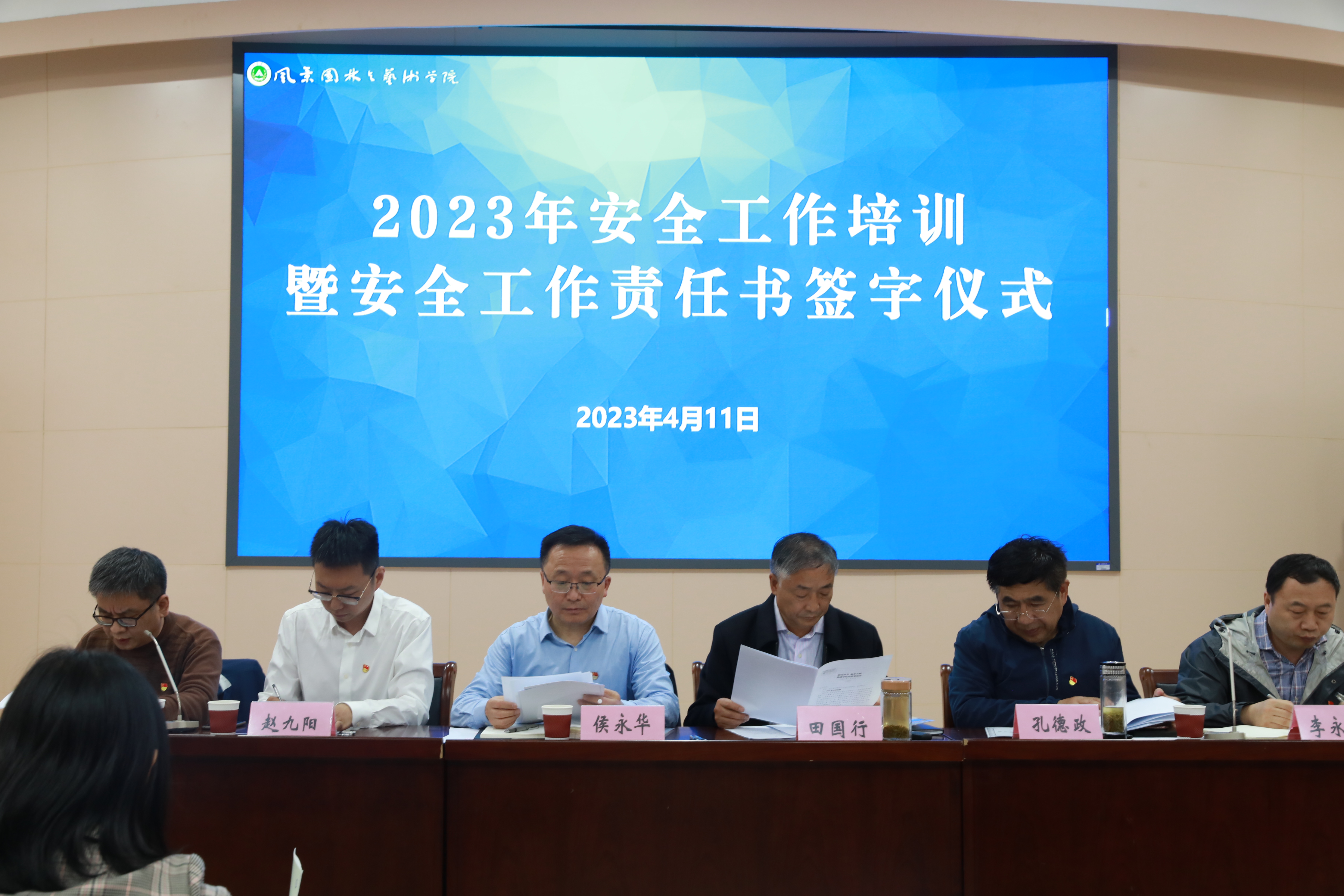 4月11日下午,性爱视频 在文化路校区召开2023年安全工作培训暨安全工作责任书签字仪式,院领导班子和全体教职工参加会议。会议由院党委副书记赵九阳主持。