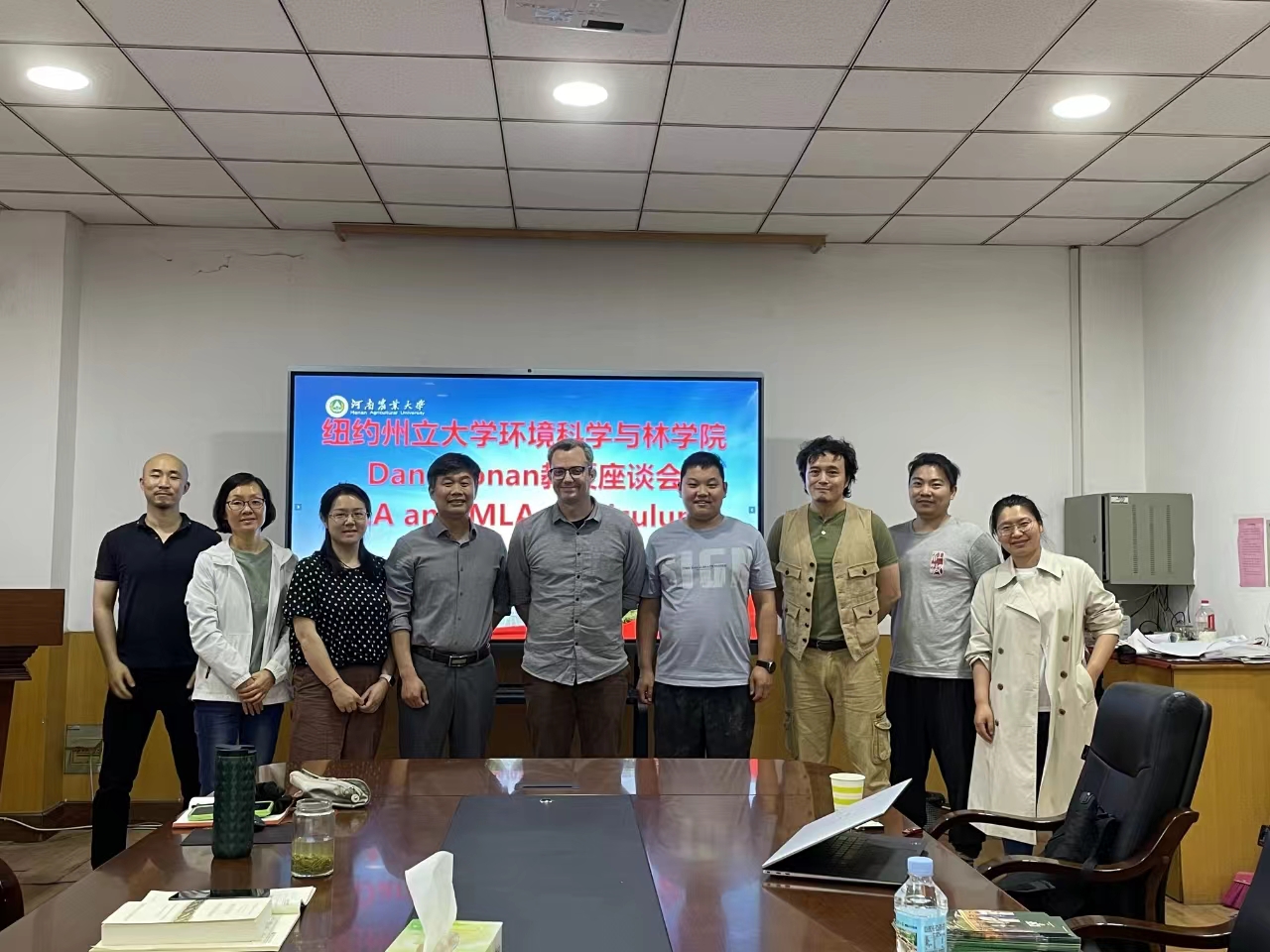 刘保国就风景园林系师资力量、科研团队、风景园林学科发展、课程体系建设等内容进行了详细介绍;宋培豪对社会服务与实践、实践项目、学生竞赛等内容进行了补充介绍。随后Dan Cronan教授详细阐述了纽约州立大学环境科学与林学院风景园林专业培养方案和课程体系。双方就风景园林专业本科教学课程体系建设中的人才培养、理论课程、实践环节、毕业设计等内容进行了激烈探讨。