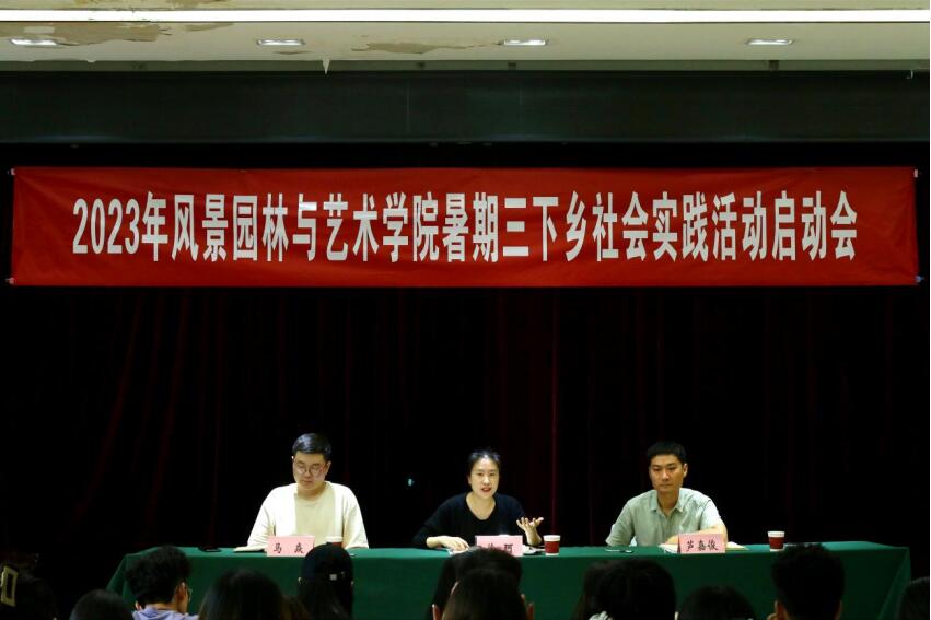 会议伊始,芦嘉俊宣读了《风景园林与艺术学院2023社会实践活动方案》,向同学们介绍社会实践活动筹备及安排情况,希望同学们积极参与实践活动,走出校园,开阔自己的视野,从中有所收获。雷锋站站长李嘉怡作为学生代表进行发言。她表示,暑期社会实践是大学生受教育、长才干、做贡献的有效载体,大学生应主动将课堂学习和社会实践紧密结合,为全面建设社会主义现代化国家贡献青春力量。马焱宣读了《风景园林与艺术学院社会实践团队工作守则》,强调了安全的重要性,要求同学们在外要做到遵纪守法、举止文明,服从属地管理。最后,徐珂结合自身大学时期的社会实践经历同同学们进行了分享交流,据此向全体同学提出三点期望:一是希望同学们提高思想认识,坚定理想信念,把社会当作大课堂,虚心向人民群众学习,脚踏实地,勤思多问,做到学思用贯通,知信行统一;二是希望同学们在实践活动中充分发挥自身专业优势,敢于吃苦,不怕困难,在美育和非遗传承等方面贡献青春力量;三是严格活动管理,筑牢安全意识,树立团队协作理念,活动中做到互帮互助,相互学习。