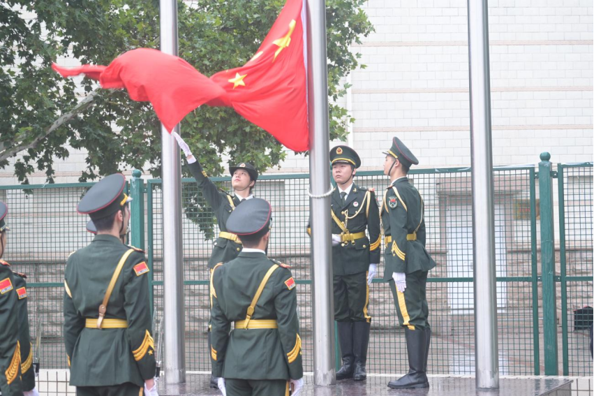 清晨7时整,升旗仪式开始,国旗护卫队着装整齐、步伐有力、口号响亮,伴随着雄壮的《义勇军进行曲》旋律,五星红旗冉冉升起,一抹“中国红”凝聚着无比磅礴的中国力量和壮志凌云的时代梦想。全体师生面向国旗行注目礼,在雨中齐唱国歌,场面庄重,令人动容。