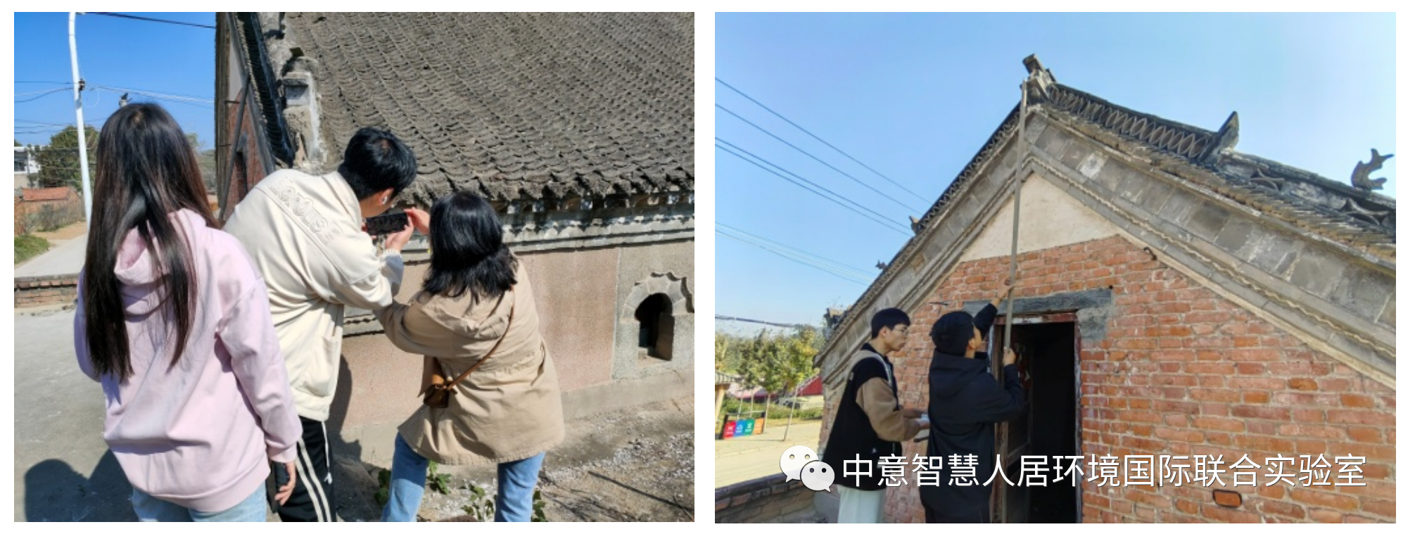 抵达现场后,根据村庄现状和近期改造计划,任课老师为同学们分配了现场调研和勘测任务,调研勘测对象主要是民居和街道。在村委会村民们的热情帮助和老师们的悉心指导下,同学们深入院落、街巷,对当地典型院落进行了测量和绘制,对当地传统民居的结构、构造、布局、装饰等特点达成初步掌握。通过与村民访谈,了解村民生活状态、宅基地使用现状以及村民对住房村庄环境改善的需求。现场调研使同学们深入专业领域一线,切实了解基层需求,收集完毕后,屯孙村村委会开放党群中心会议室供师生休息交流,卫红老师与苏芳老师对学生们现场采集的数据和图纸进行评讲,部分学生在评图后为发现问题进行了数据补采,进而提出具有现实可行性的解决方案的能力。