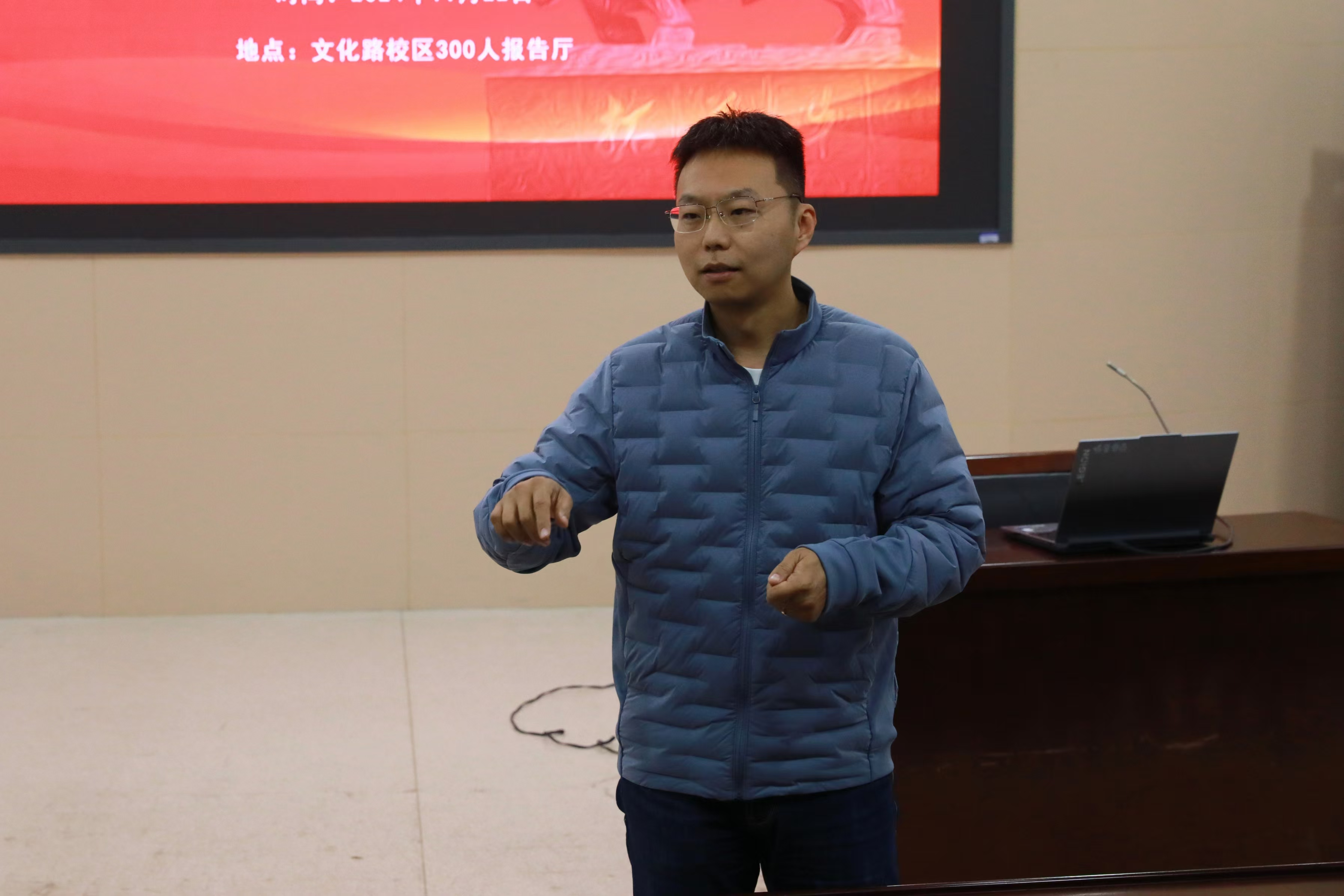 于文化路校区300人报告厅开展2025届毕业生考研党员送温暖活动。院党委副书记赵九阳、院团委书记徐珂、教师代表李雨澍、史玥、蔚洪波及2021级辅导员芦嘉俊出席会议。会议由芦嘉俊主持。