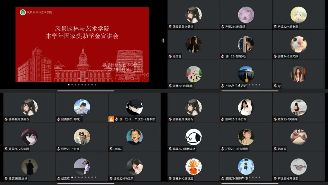 会议围绕《风景园林与艺术学院2025年本科生国家奖助学金评审发放工作的通知》要求,系统介绍了本年度的评审政策与具体安排。内容包括评选原则、评选范围、评选条件、评选名额及奖励标准、评审组织程序、材料填报要求、相关注意事项以及监督咨询与举报方式等七大方面,并对国家奖学金、国家励志奖学金和国家助学金三类项目的申请资格、评审标准和发放流程分别作了详细解读。