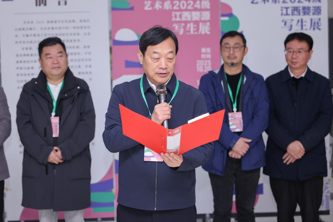 院长李永华致辞。他对莅临现场的各位领导、教师和学生表示热烈欢迎,并向为此次展览付出的同学们表示由衷的感谢!他强调,此次婺源之行,是画技的精进,是文化自信的增强和团队精神的培养,是艺术发展道路的宝贵财富,更是学院践行“立德树人”教育方针、深化实践教学改革的生动体现。艺术的生命在于继承,更在于创新,今天的作品展既是对同学婺源写生成果的集中检阅,也是学院艺术教育成效的生动展示,更是难得的艺术交流盛会。最后,李永华对同学们寄予深切鼓励与殷切期望,勉励大家始终怀揣对自然的敬畏之心,坚守对美好的热忱追求,在充满无限可能的艺术之路上步履不停、行稳致远。